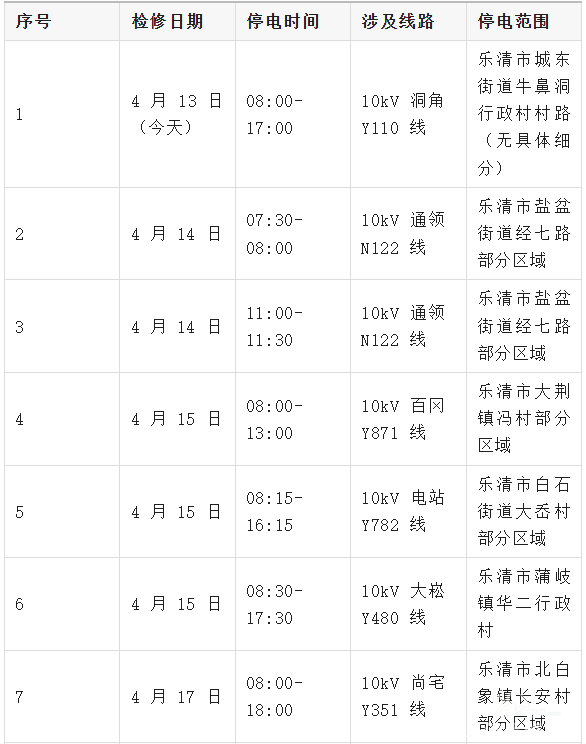 各位乐清的街坊邻居注意啦!国网乐清市供电公司发布了最新的电力设备检修预告,2026 年 4 月 13 日到 4 月 19 日,多个片区会有计划停电,大家一定要提前做好准备,别耽误了日常用电和生产安排! 一、温馨提醒先 ...
