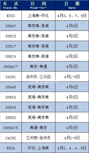据上海铁路客户服务中心消息,在加强疫情防控工作的同时,增开上海南-怀化K533、南京-南通D9546/7、兰州西-徐州东G4292等部分车次。 统计截止日:4月1日 增开列车车次及时间以车站公告为准,后续增开列车信息 ...