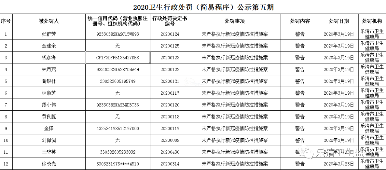2020卫生行政处罚(简易程序)公示第五期 来源:乐清卫生监督