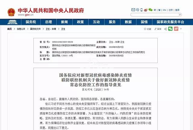 国务院应对新型冠状病毒感染肺炎疫情联防联控机制关于做好新冠肺炎疫情常态化防控工作的指导意见 国发明电〔2020〕14号 各省、自治区、直辖市人民政府,国务院各部委、各直属机构: 在以习近平同志为核 ...