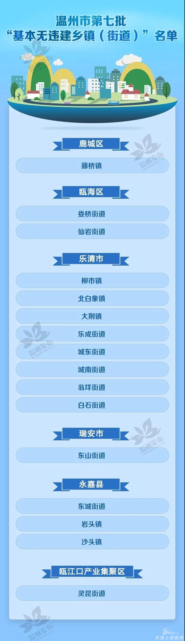 日前,温州公布第一批“无违建乡镇(街道)”和第七批“基本无违建乡镇(街道)”。洞头区北岙街道等22个乡镇(街道)入选温州市第一批“无违建乡镇(街道)”,鹿城区藤桥镇等16个乡镇(街道)入选温州市第七批 ...