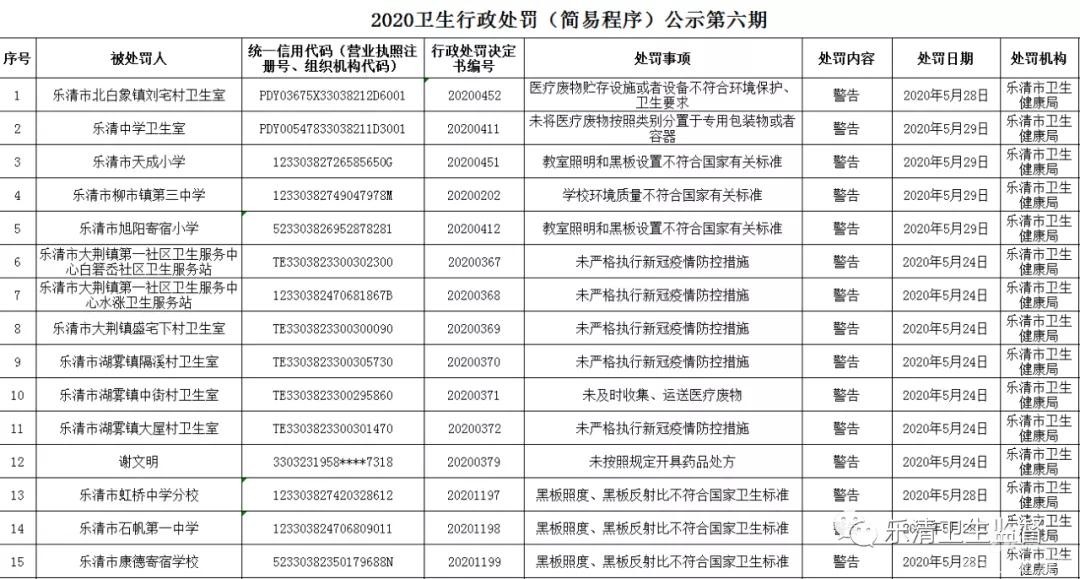 2020卫生行政处罚(简易程序)公示第六期 来源:乐清卫生监督