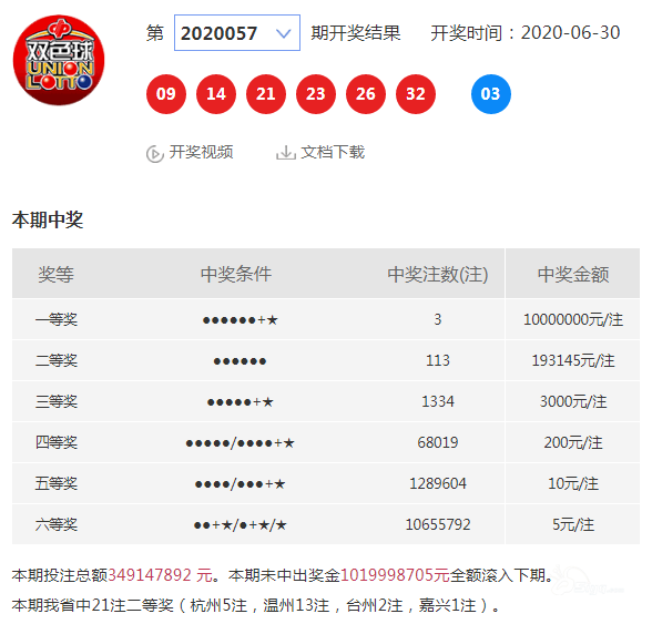 第057期-开奖信息- 06月30日晚,中国福利彩票双色球游戏进行第2020057期开奖。当期双色球红球号码为09、14、21、23、26、32,蓝球号码为03。 当期双色球头奖3注,单注奖金为1000万元。这3注一等奖花落3地, ...