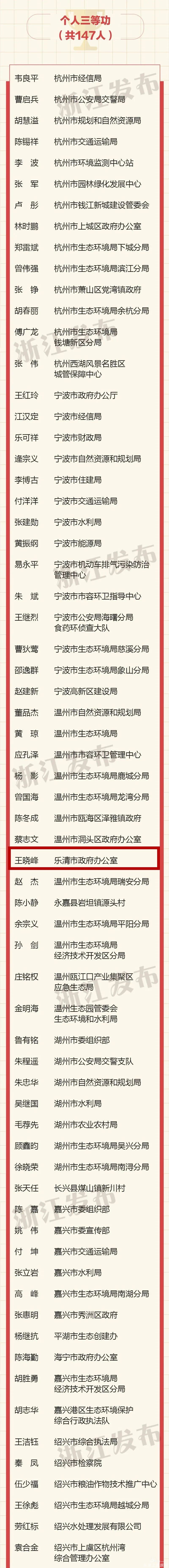 为激励先进、树立典型,深入推动新时代美丽浙江建设,省政府近日印发文件,决定给予杭州市生态环境局富阳分局等14个单位记集体二等功,给予周健等52人记个人二等功,给予杭州市发展改革委资环处等66个单位记集体三等 ...