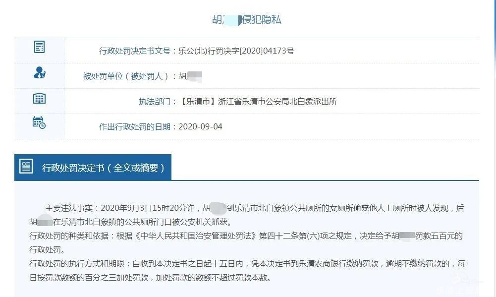 主要违法事实: 2020年9月3日15时20分许,胡**到乐清市北白象镇公共厕所的女厕所偷窥他人上厕所时被人发现,后胡**在乐清市北白象镇的公共厕所门口被公安机关抓获。 行政处罚的种类和依据: 根据《中华人 ...