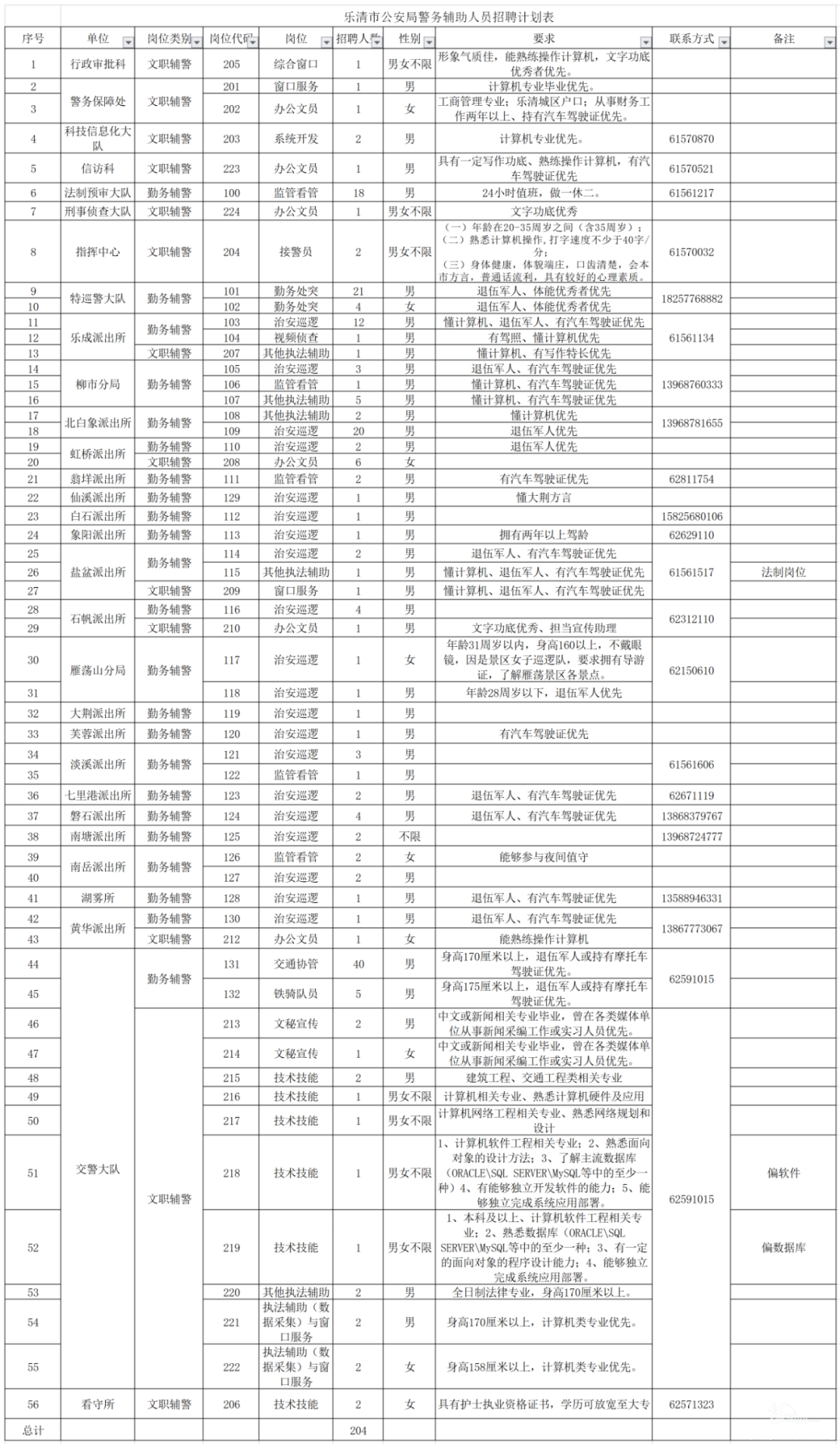 因工作需要,根据警务辅助人员管理工作有关规定,乐清市公安局现面向社会公开招聘警务辅助人员,相关事项如下: 01.招聘计划 本次计划招聘警务辅助人员204名 其中文职辅警36名、勤务辅警168名 (具体招 ...