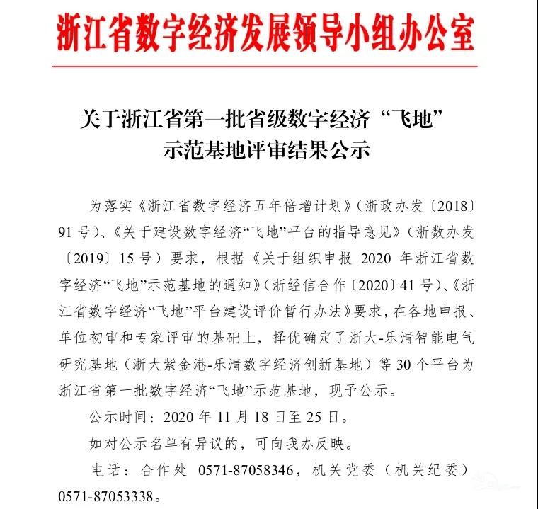 近日,浙江省数字经济发展领导小组办公室在各地申报、单位初审和专家评审的基础上,择优确定了浙大-乐清智能电气研究基地(浙大紫金港-乐清数字经济创新基地)等30 个平台为浙江省第一批数字经济“飞 ...
