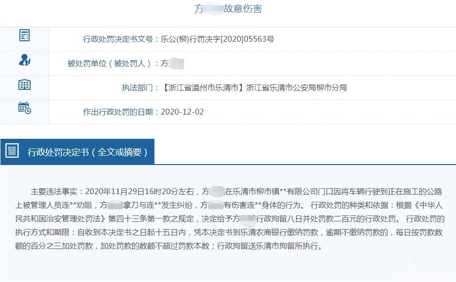 行政处罚决定书(全文或摘要)主要违法事实:2020年11月29日16时20分左右,方**在乐清市柳市镇**有限公司门口因将车辆行驶到正在施工的公路上被管理人员连**劝阻,方**拿刀与连**发生纠纷,方**有伤害连**身体 ...