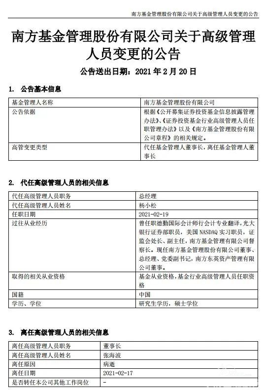 2021年农历新年刚过,金融圈传出一则噩耗。2月17日凌晨,南方基金管理股份有限公司(简称“南方基金”)党委书记、董事长张海波因病在南京去世,年仅58岁。 2月19日晚间,南方基金正式对外发布公告,宣布了这一消 ...