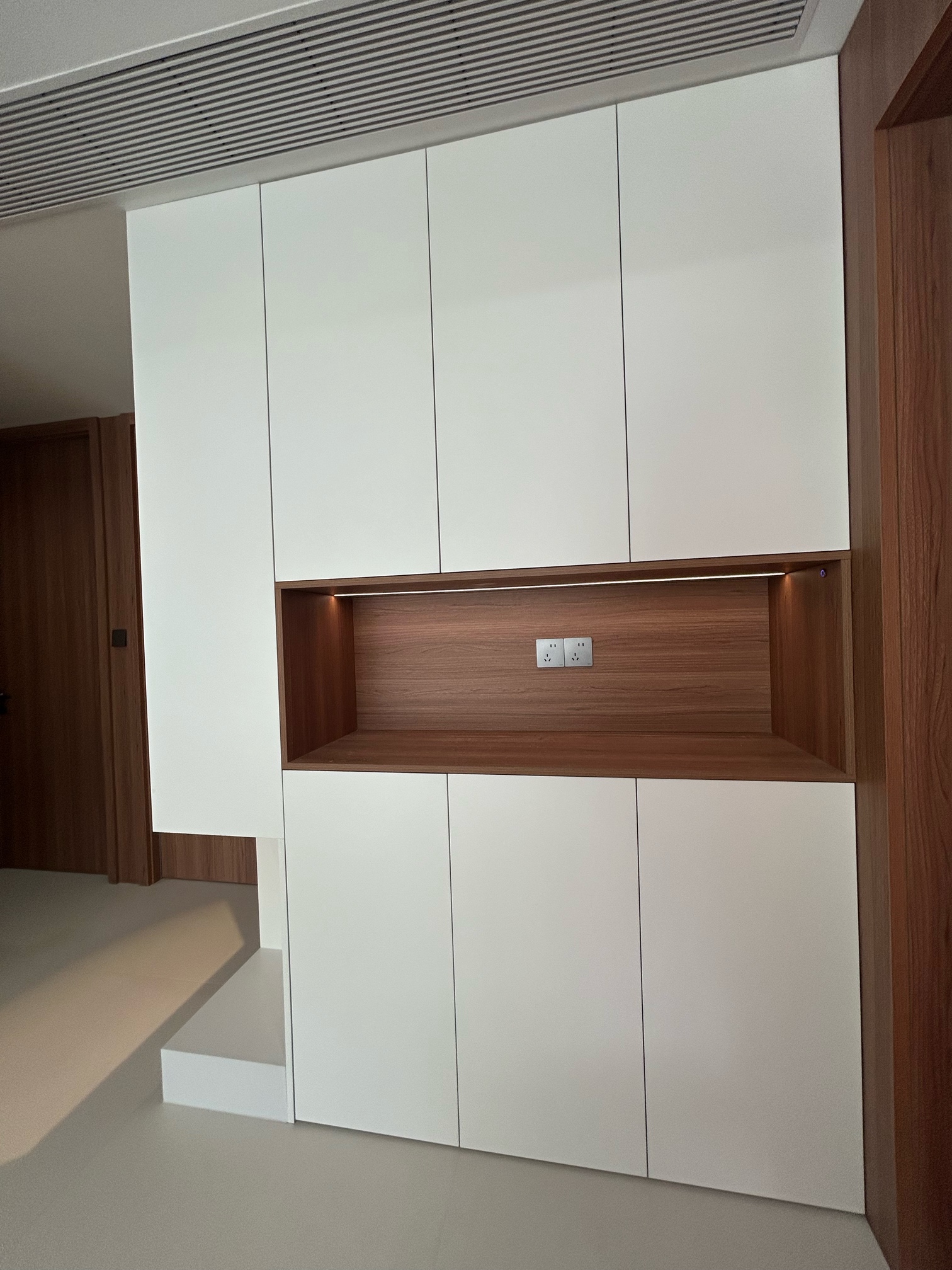 这是一套现代简约风格的全屋定制木作系统,核心特点是简洁线条+材质碰撞+功能整合,很适合追求质感与实用的都市家庭。